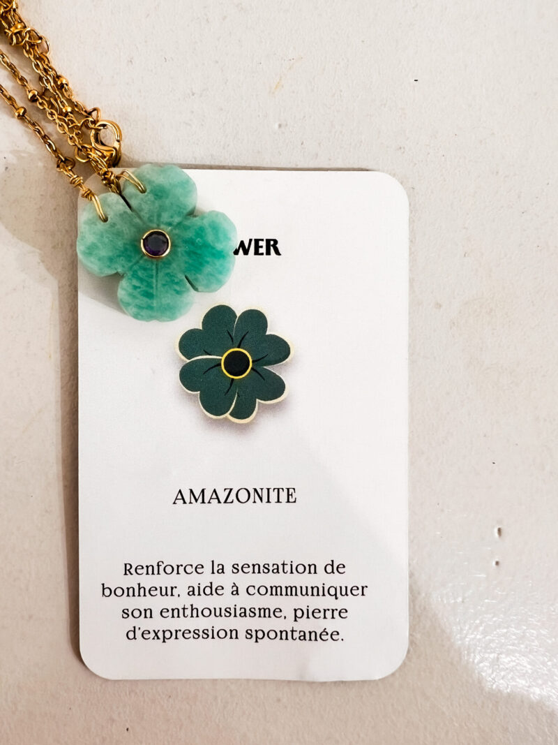 La fleur est en Amazonite (vert d’eau) : renforce la sensation de bonheur, aide à communiquer son enthousiasme Des bijoux pas que jolis 🧿 faits main en pierres semi-précieuses