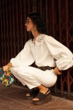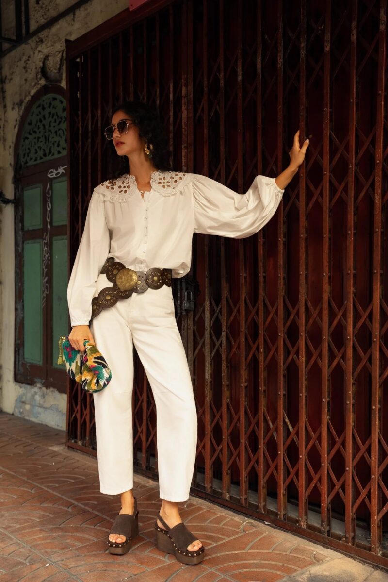 Le jean Brandy est un jean coupe balloon. La jambe se révèle plus ample au niveau de la cuisse et du genou, tout en demeurant subtilement ajustée à la taille et à la cheville, pour une silhouette harmonieuse et raffinée.