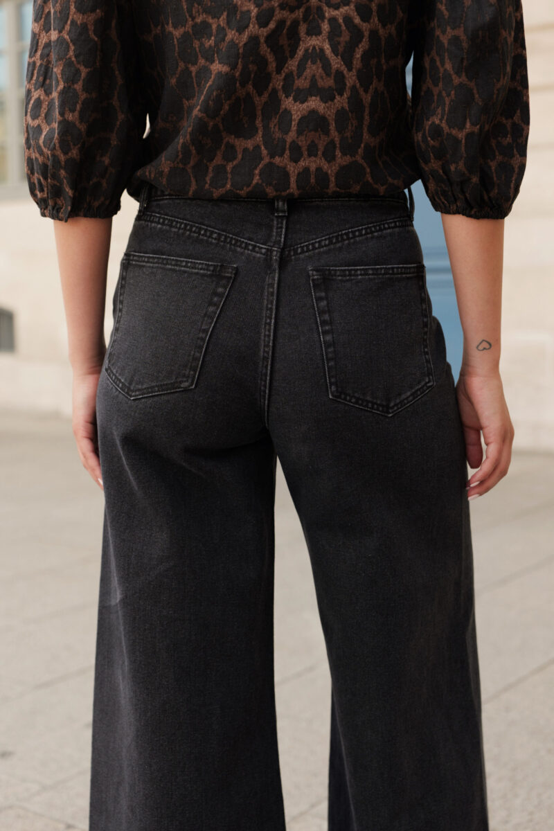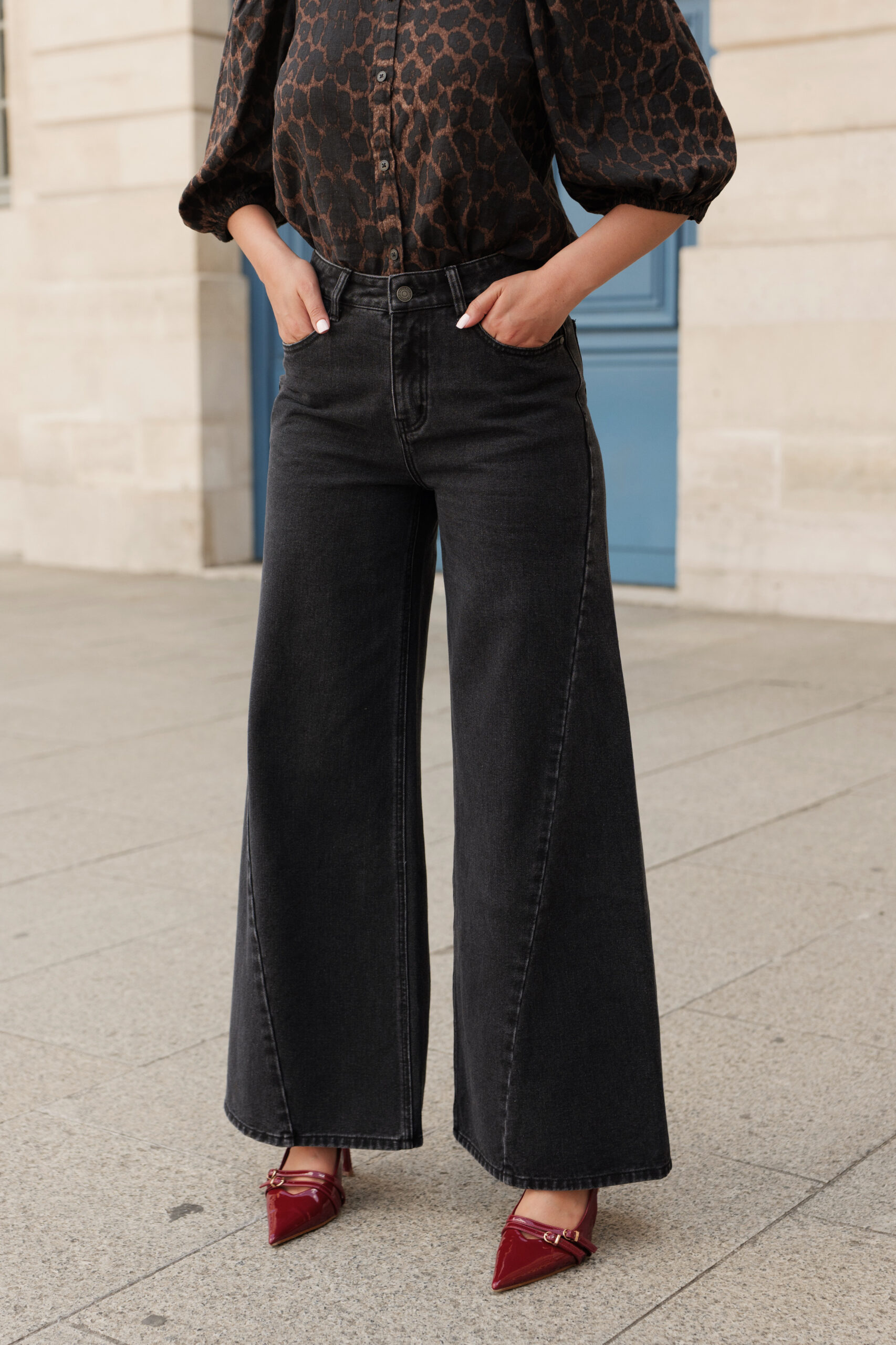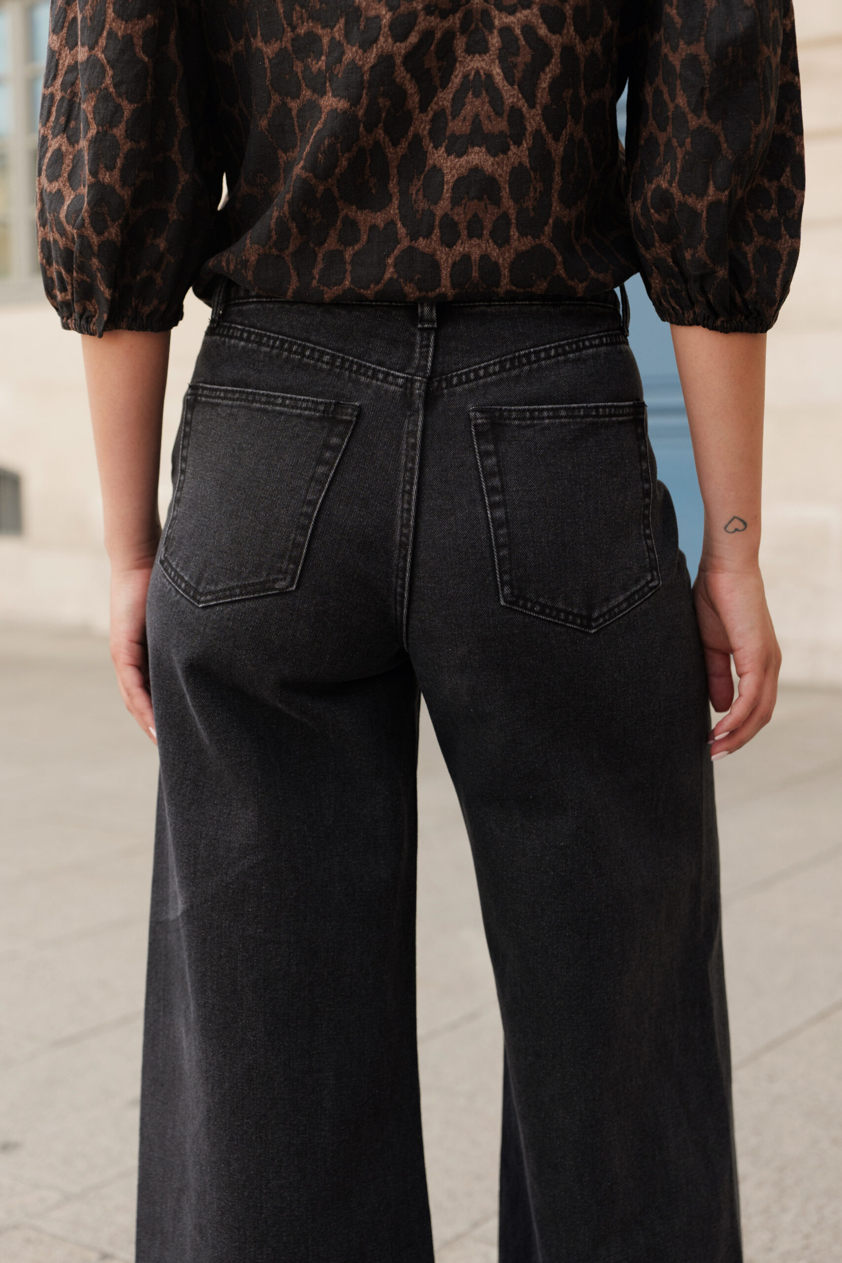 Jeans coupe Palazzo. Taille haute passant pour ceinture, fermeture zip et boutons.