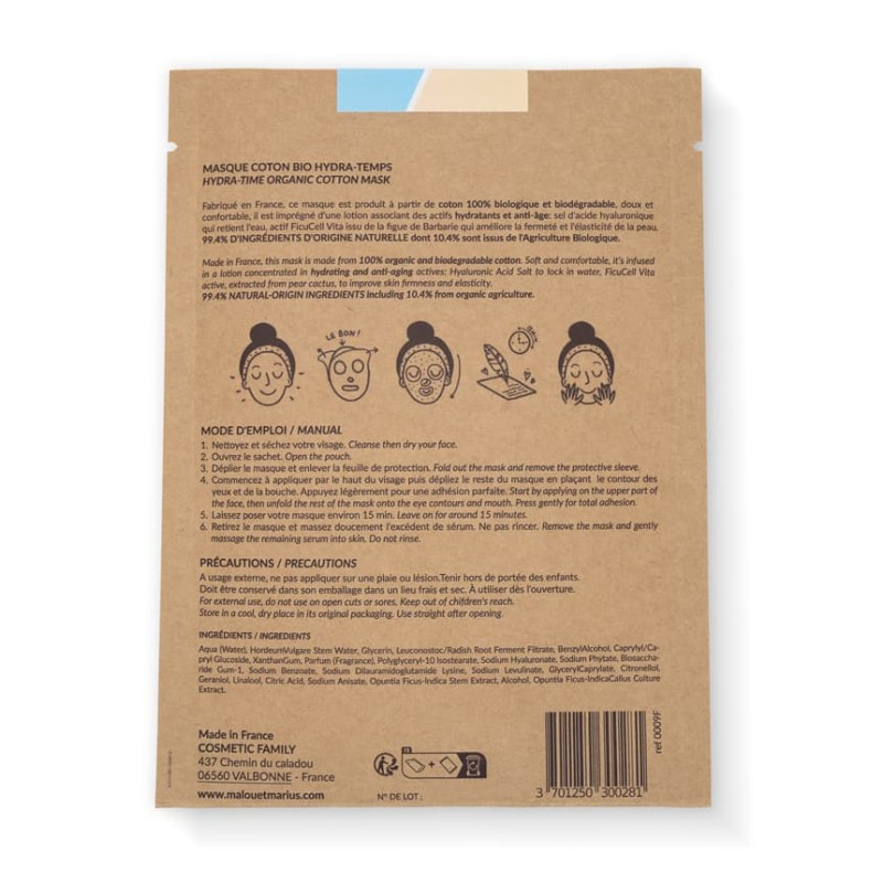 Ce masque est fabriqué à base de coton biologique et biodégradable. Il est doux et confortable à la pose.