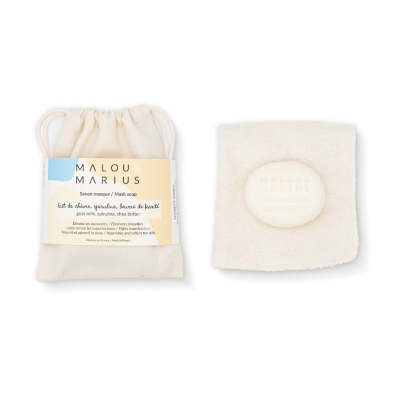 Le pochon contient un savon masque de 60 grammes et une serviette visage coton organique 25 par 25 centimètres.