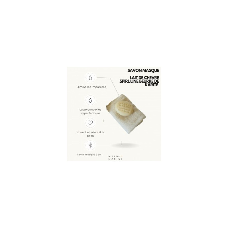 Ce savon masque est un véritable soin. Il est formulé à base d’ingrédients d’origine naturelle, lait de chèvre, spiruline et beurre de karité.