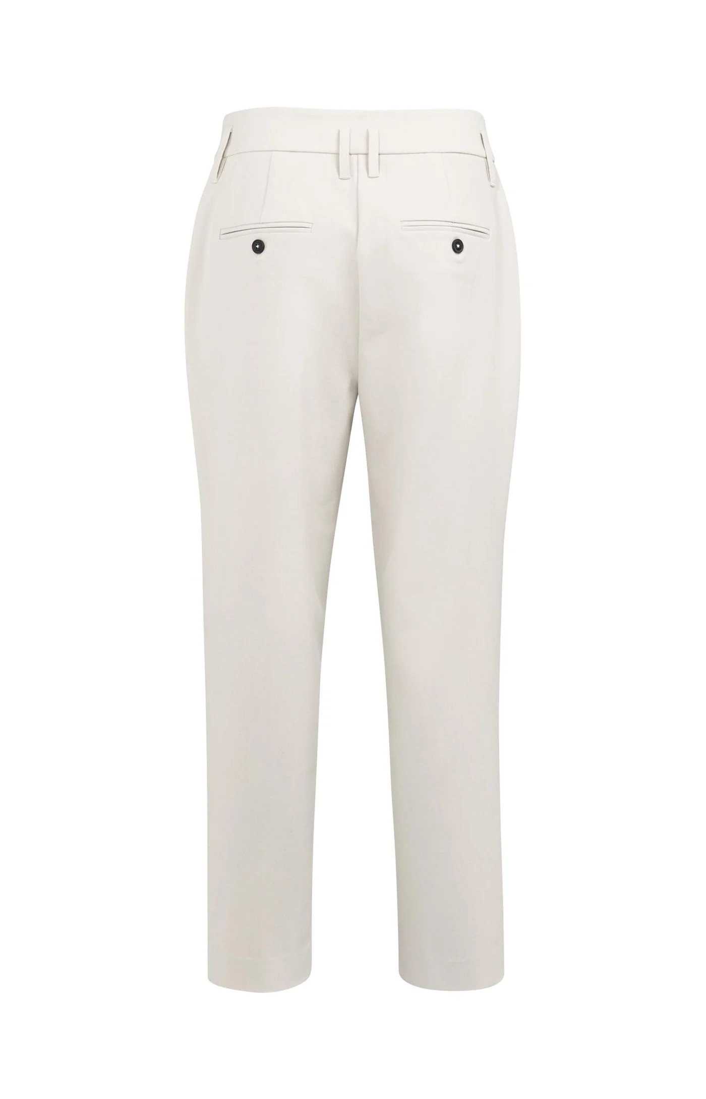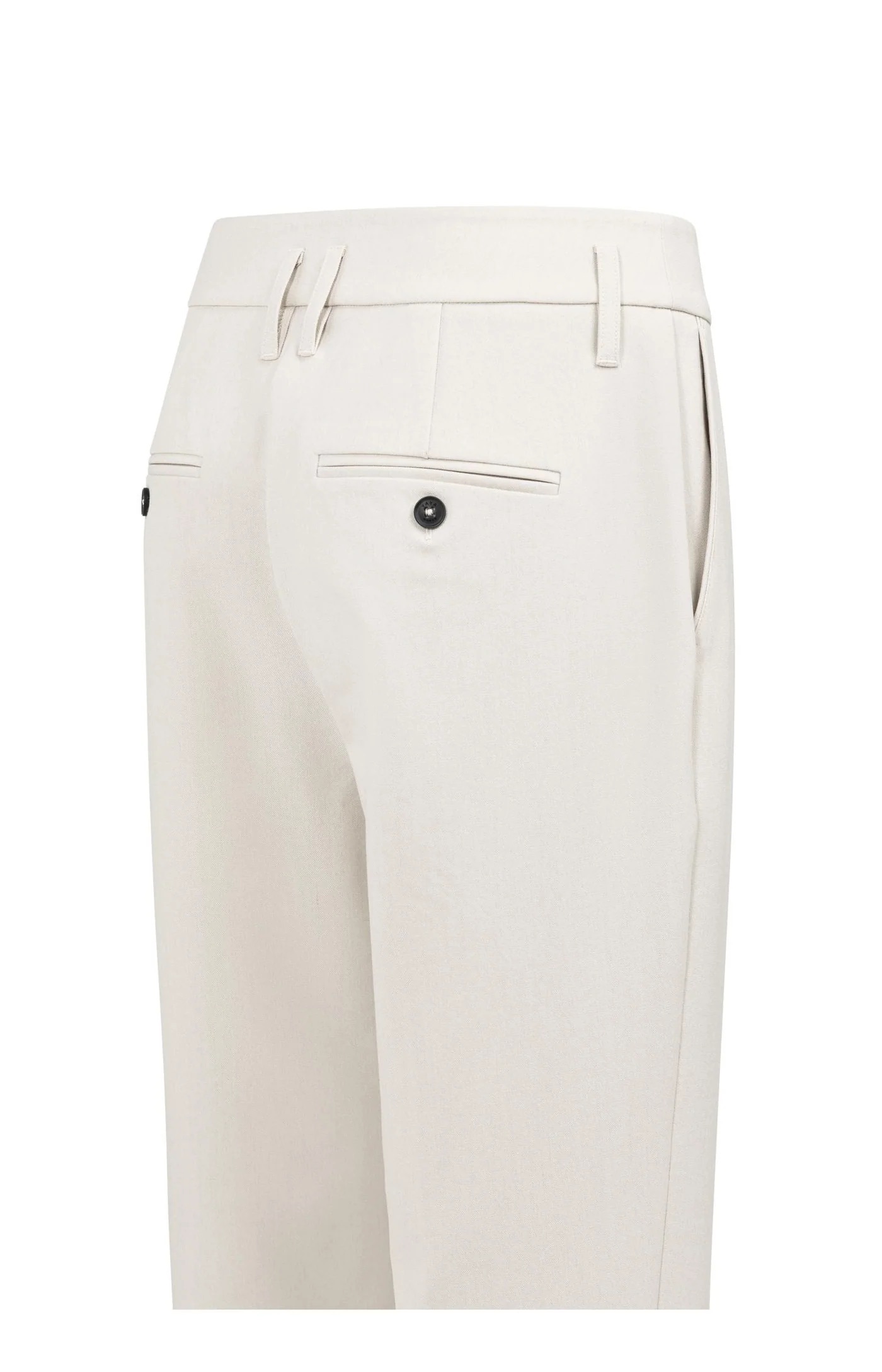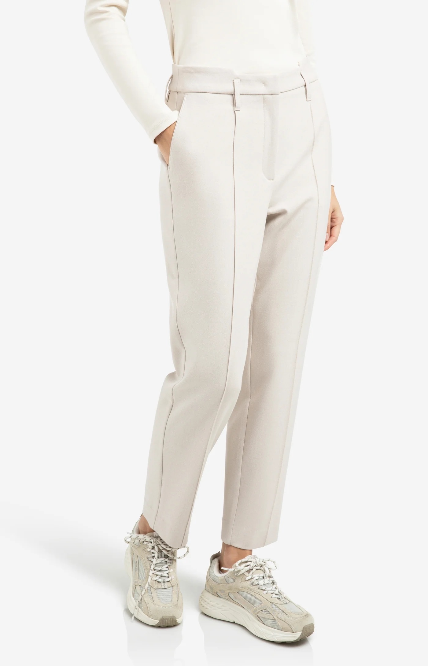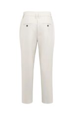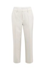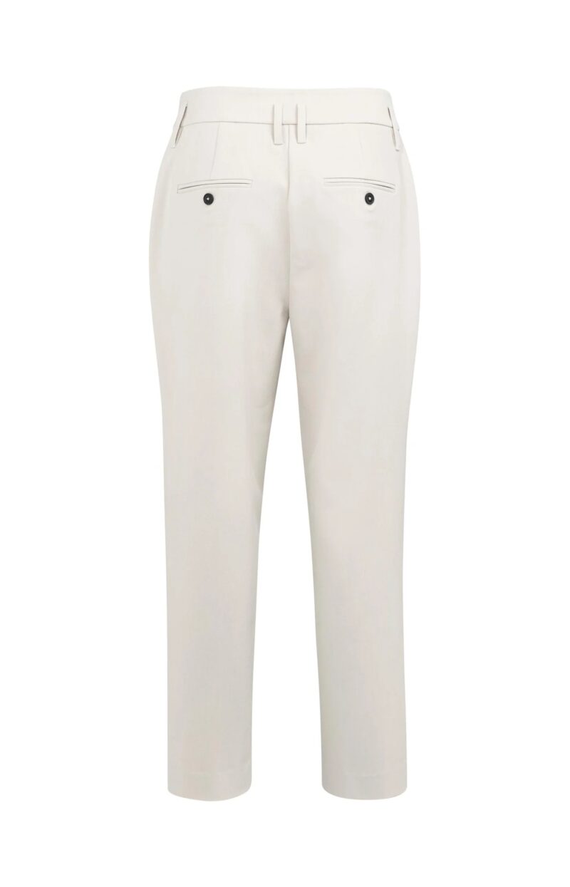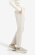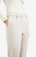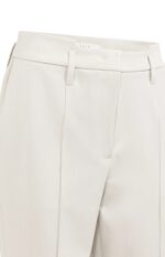 Ce pantalon élégant est fabriqué dans un tissu doux et confortable et présente une taille taille haute avec un insert élastique à l’arrière. Les jambes larges créent une silhouette flatteuse, tandis que les poches passepoilées et les plis pressés ajoutent une touche raffinée. Parfait pour les looks décontractés et habillés grâce à leur design polyvalent et à leur finition épurée. Le modèle mesure 178 cm et porte une taille 36.