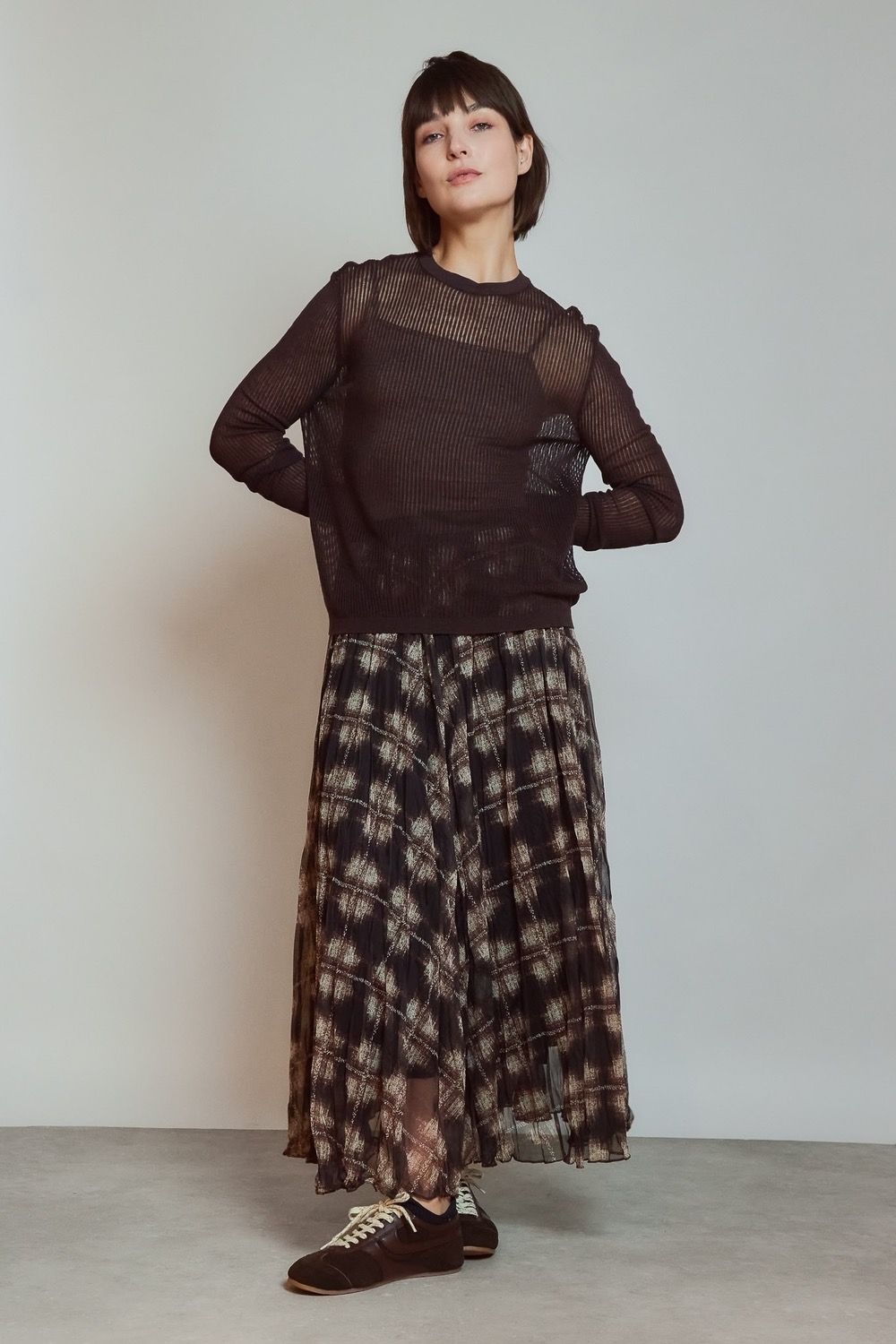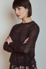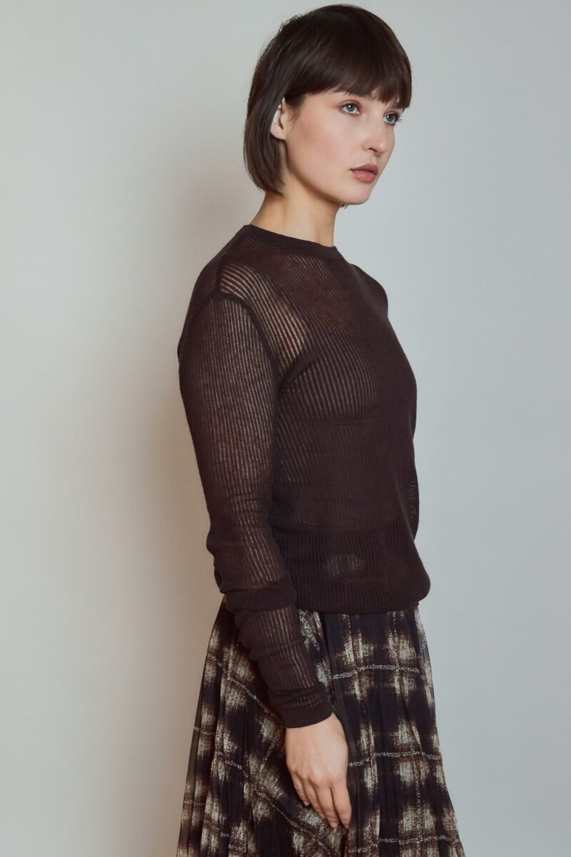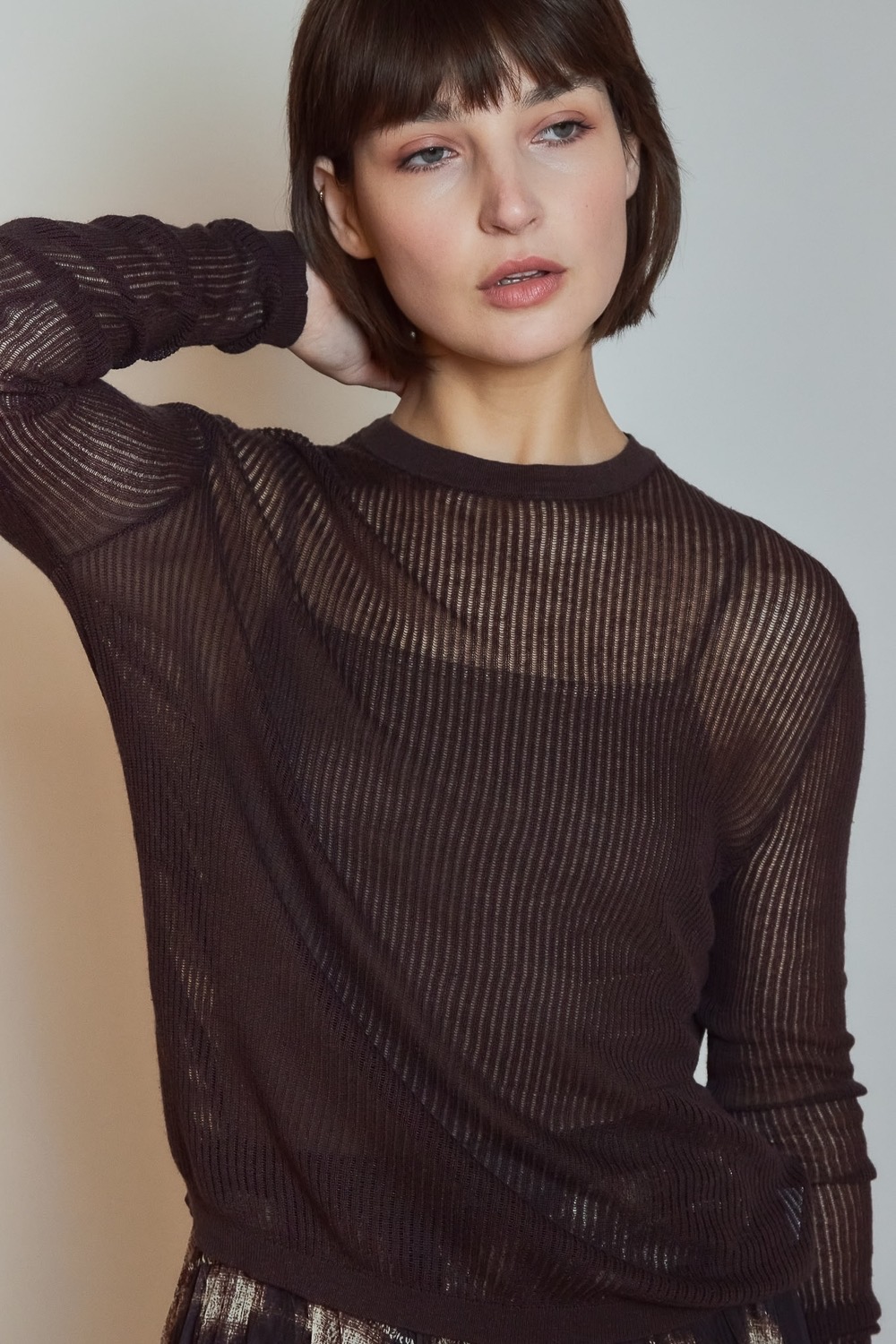 - Pull fin à manches longues et col rond. Design transparent à rayures verticales, parfait pour superposer et créer des looks contemporains. Coupe ajustée pour une silhouette élancée.