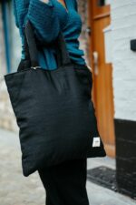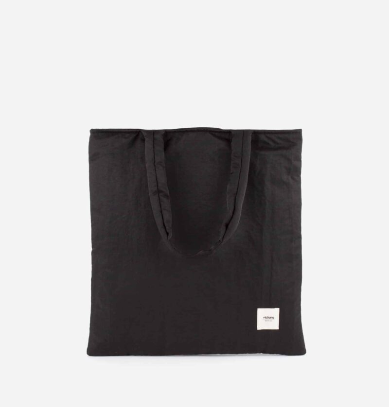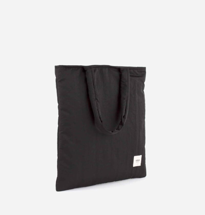 Maxi sac noir matelassé fabriqué en nylon avec des anses de la même matière. Fermeture clip, doublure intérieure et poche intérieure à fermeture éclair. Il affiche également des détails d’étiquettes en coton personnalisées à l’extérieur et une poche intérieure.