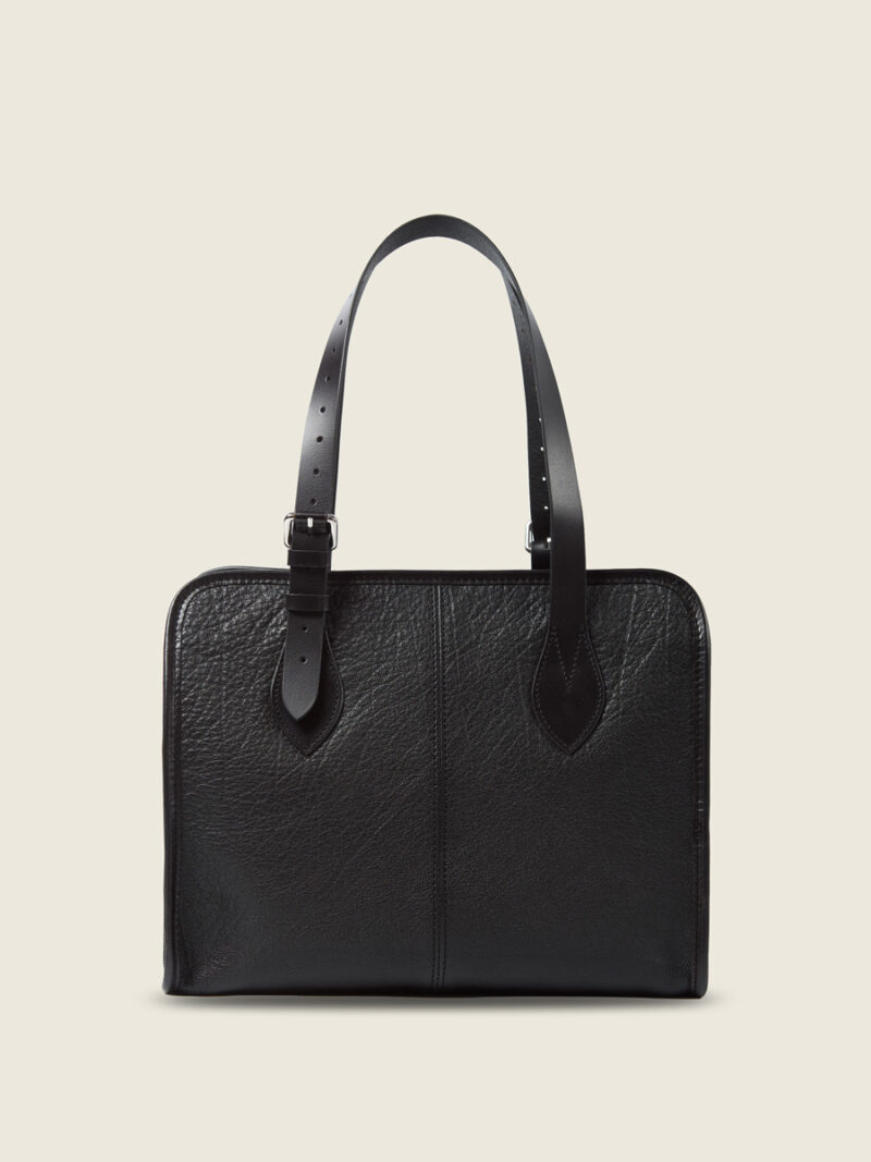 Sa grande poche intérieure en cuir structure l’espace, tandis que les garnitures façon ceinture renforcent la tenue du sac. Les poignées ajustables et la fermeture zippée en font un compagnon fiable, pensé pour accompagner une journée bien remplie.