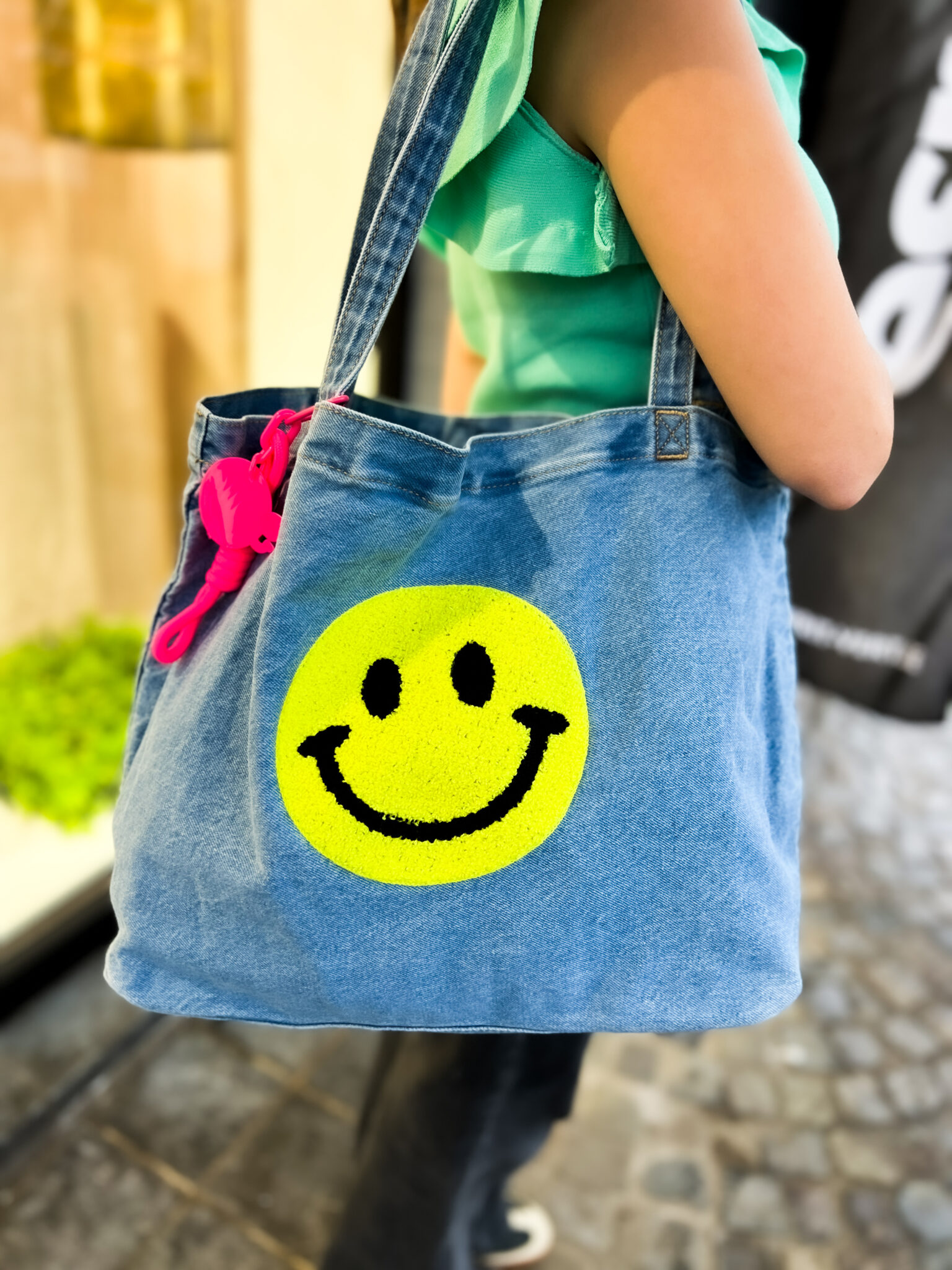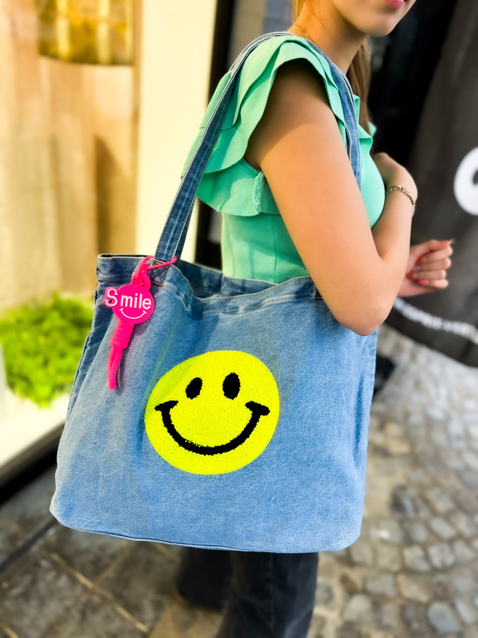 Sac en coton denim floqué – SMILE – bleu et jaune