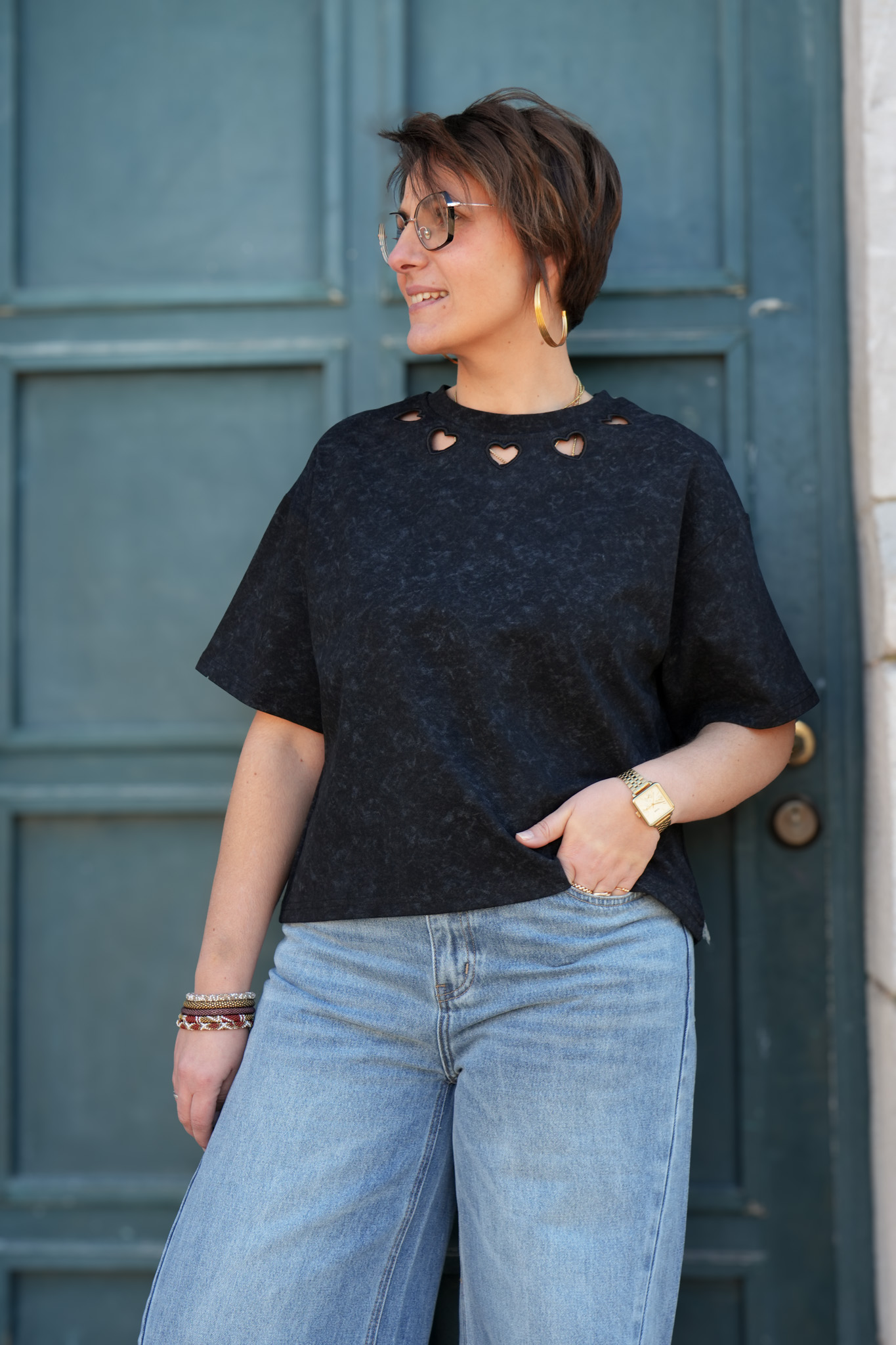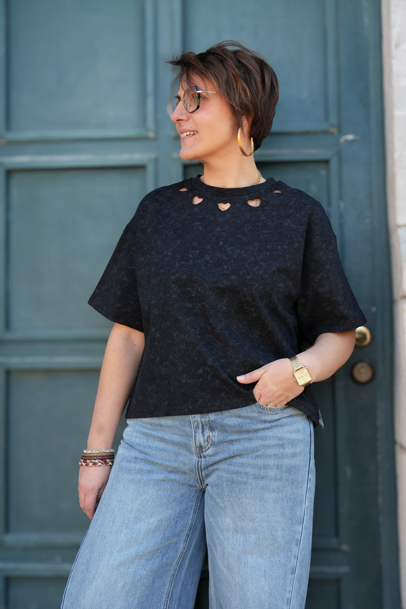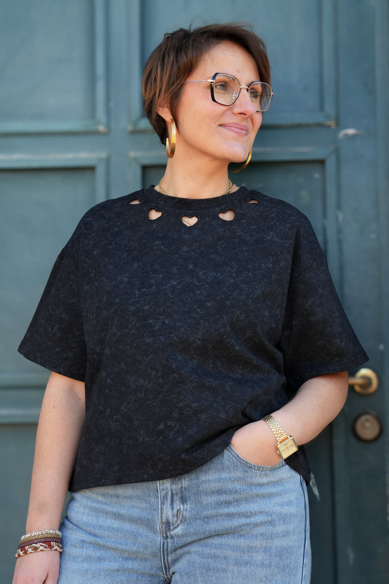 T-shirt uni délavé détail au col – Coeur – Noir