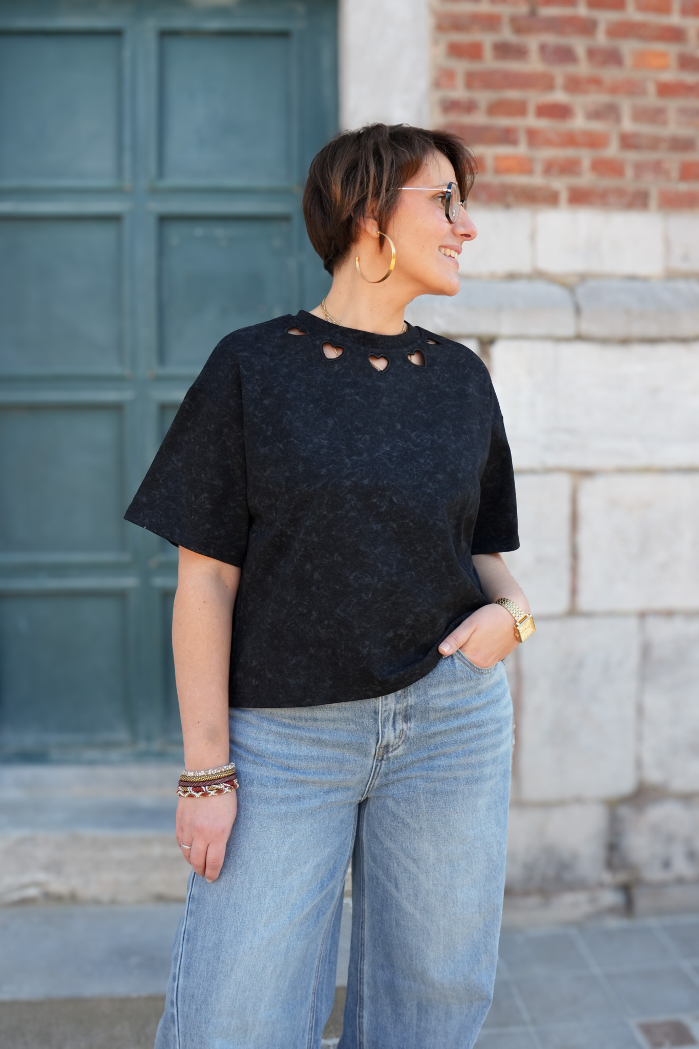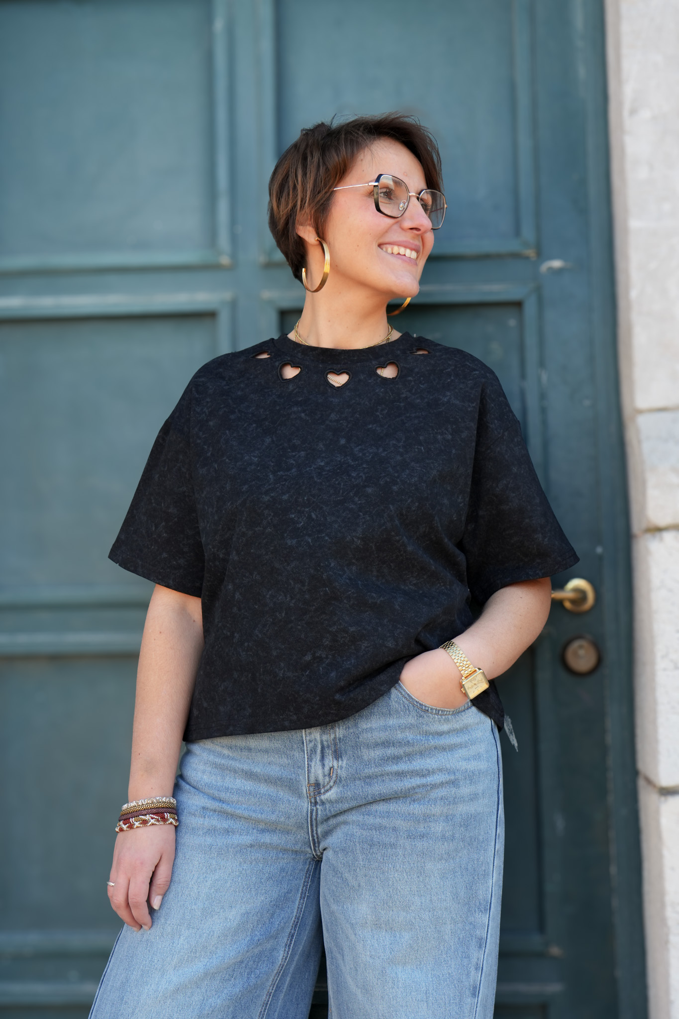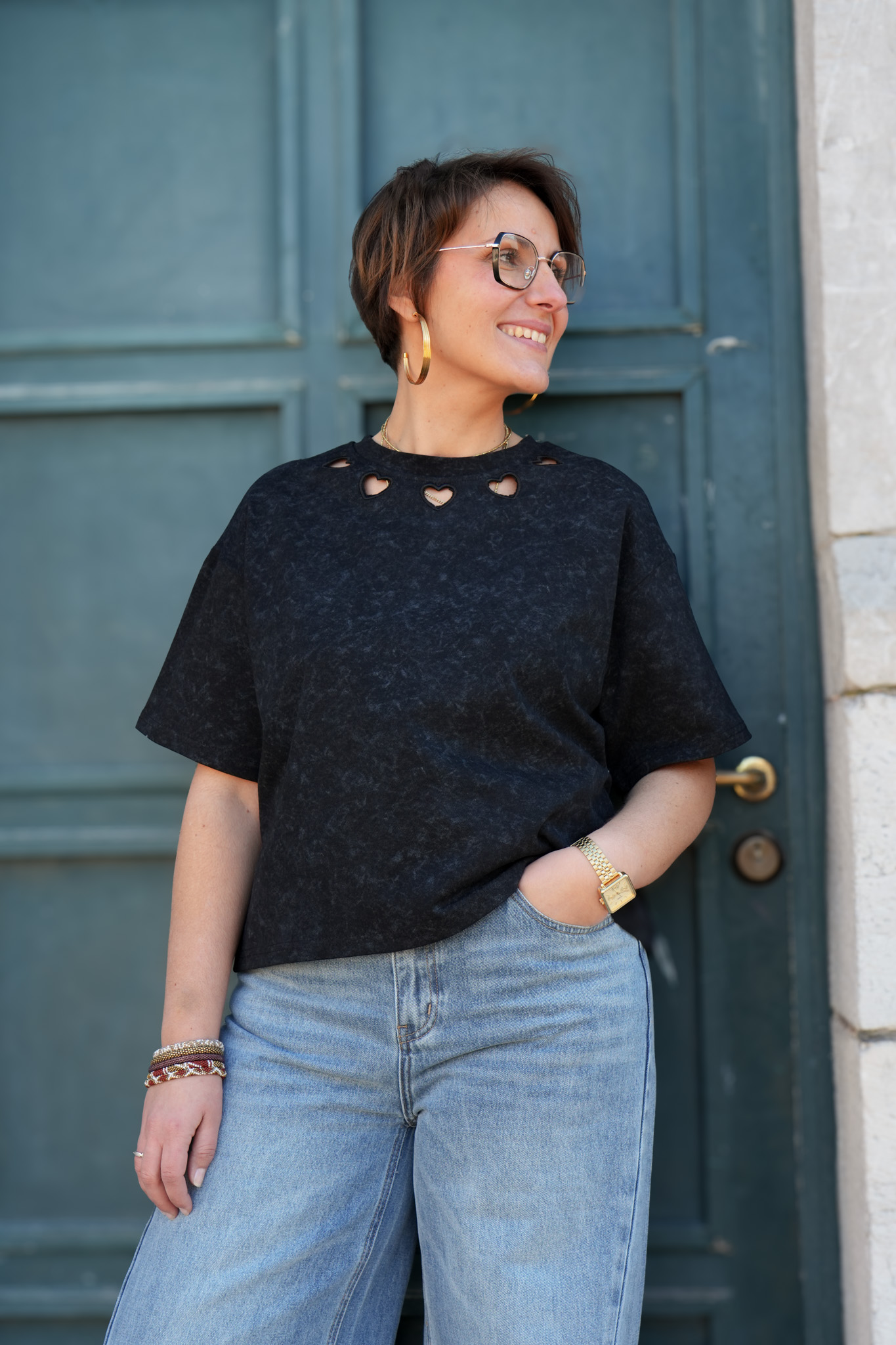 T-shirt uni délavé détail au col – Coeur – Noir